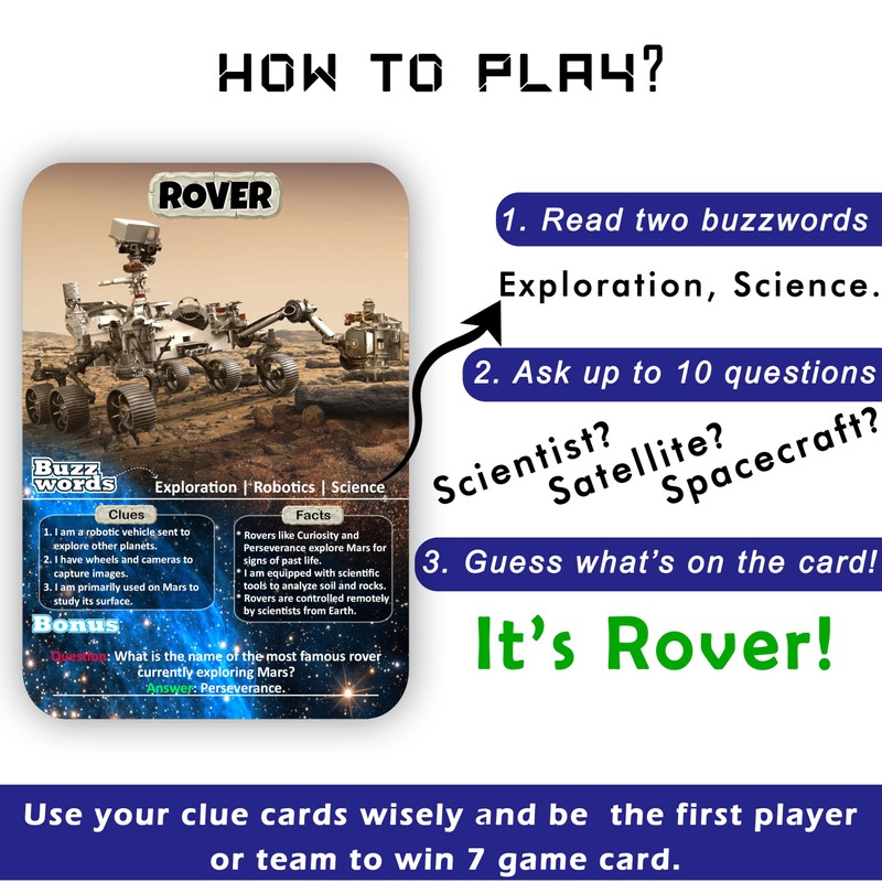 • ULTIMATE GUESSING GAME: Divide yourselves into teams, or play one on one. Ask up to 10 questions to guess what's on the game card! Is it a planet? Does it emit its own light? Think hard, ask intelligent questions, use your clue cards wisely, and be the first player to collect 7 game cards to win!