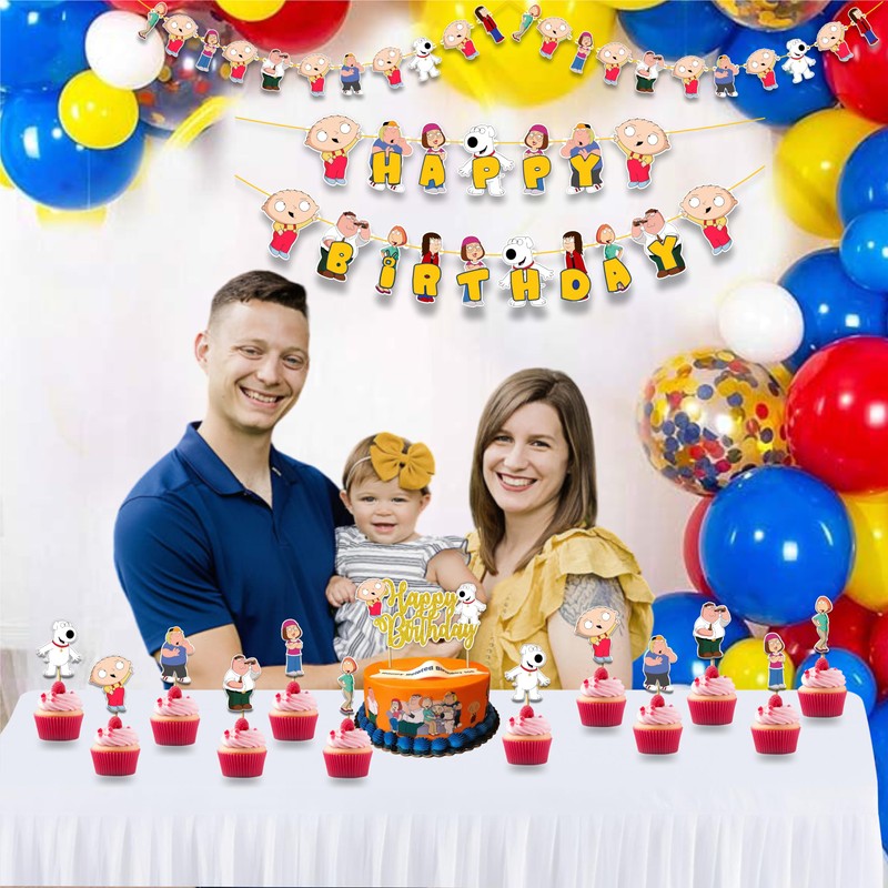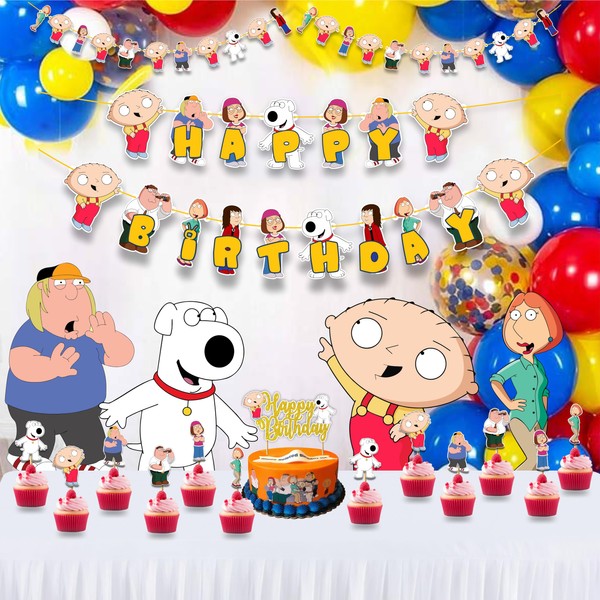• 🎀 This Stewe Grifin Birthday party supplies set Includes: ✔1 Happy birthday banner ✔ 24 Cupcake toppers ✔ 1 Happy birthday cake topper ✔ 100pcs (Yellow,White & Red) Balloons.