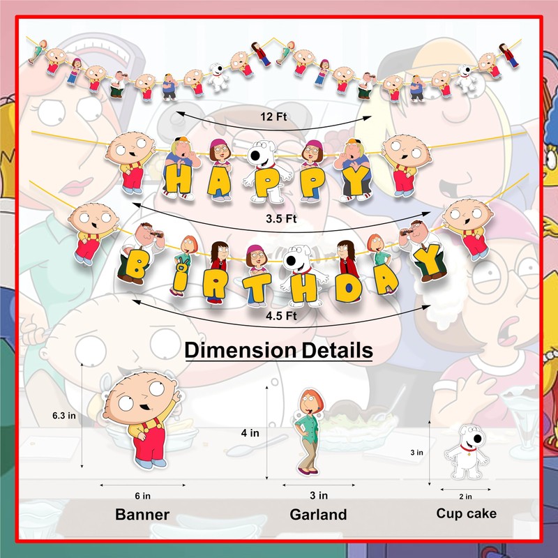 🎉Theme Decoration: This party decoration set is themed on Stewe Grifin. It has classic interesting elements and bright colours that makes them full of fun; They are convenient to hang up and make combinations. These are definitely the best choice for a theme party. 🎉Package Includes: Happy Birthday Banner – 1pcs, Garland Decoration – 1pcs, Happy Birthday Cake Topper – 1pcs, Cupcake topper – 24 pcs. 🎉Premium Quality Materials: Our “Happy Birthday” Banner, Garland, Cake Topper and Cupcake Toppers and is made of High-Quality GSM. 🎉Wide Application: This theme party decoration supplies can be used for birthday parties, theme party supplies and also can be your room decoration. Make your special occasion even more special with these stylish theme party supplies. 🎉Size of each product: As shown in Image.