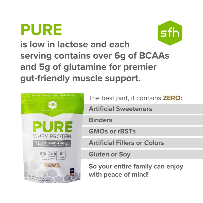 - CLEAN GRASS-FED WHEY PROTEIN: SFH PURE Whey Protein is a highly bioavailable (easy to absorb and digest) whey concentrate. An excellent protein choice for all ages, it provides a number of benefits in areas including sports nutrition, weight management, immune support, bone health, and general wellness. Safe for children, pregnant, and nursing. Completely non-GMO and free of soy, gluten, artificial flavors and sweeteners, and rBST.