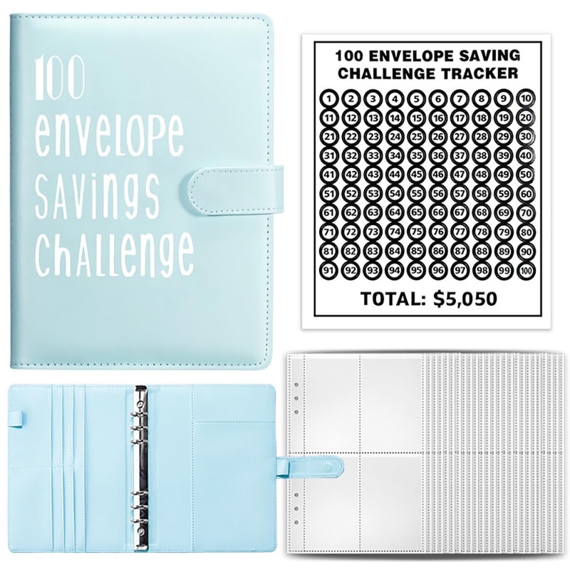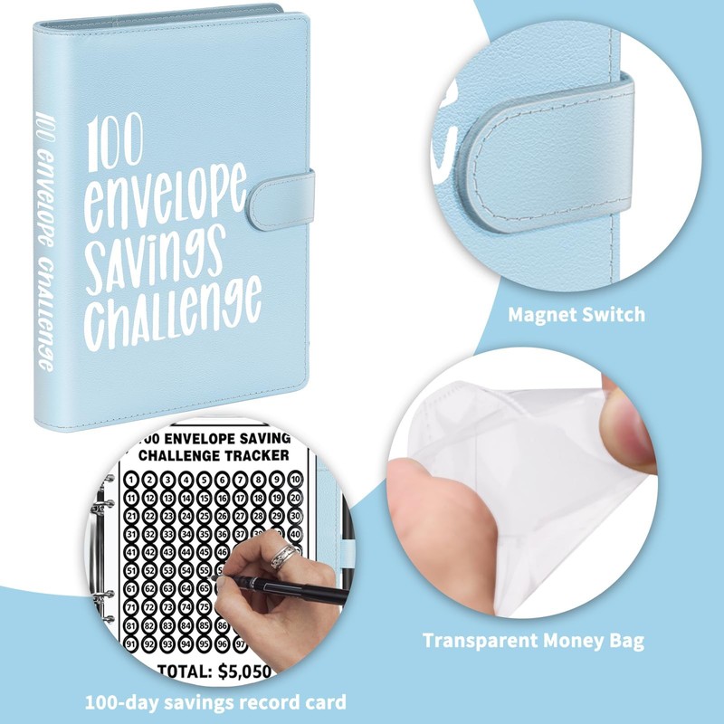 Sfocgoi 100 Envelopes Money Saving Challenge, 2025 A5 Money Saving Budget Binder, Savings Challenges Book and Digital Stickers, Easy and Fun Way to Save $5,050 (Blue)