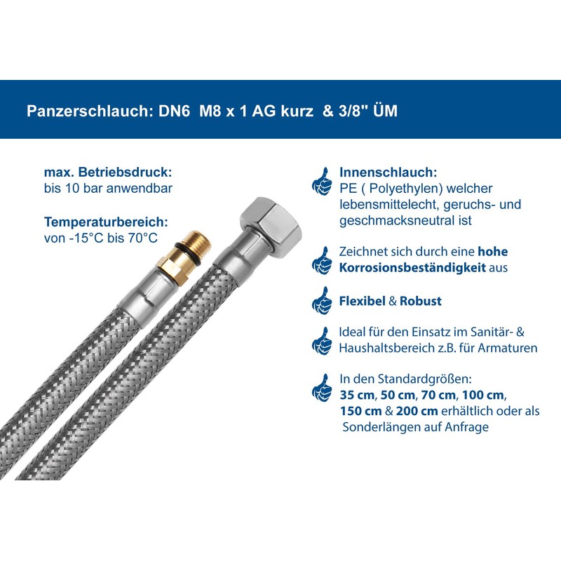 - Safety pressure hose M8 x 1 male thread short x 3/8 inch nut / IG, pressure: up to 10 bar - temperature up to 90 °C - extremely flexible and kink-resistant