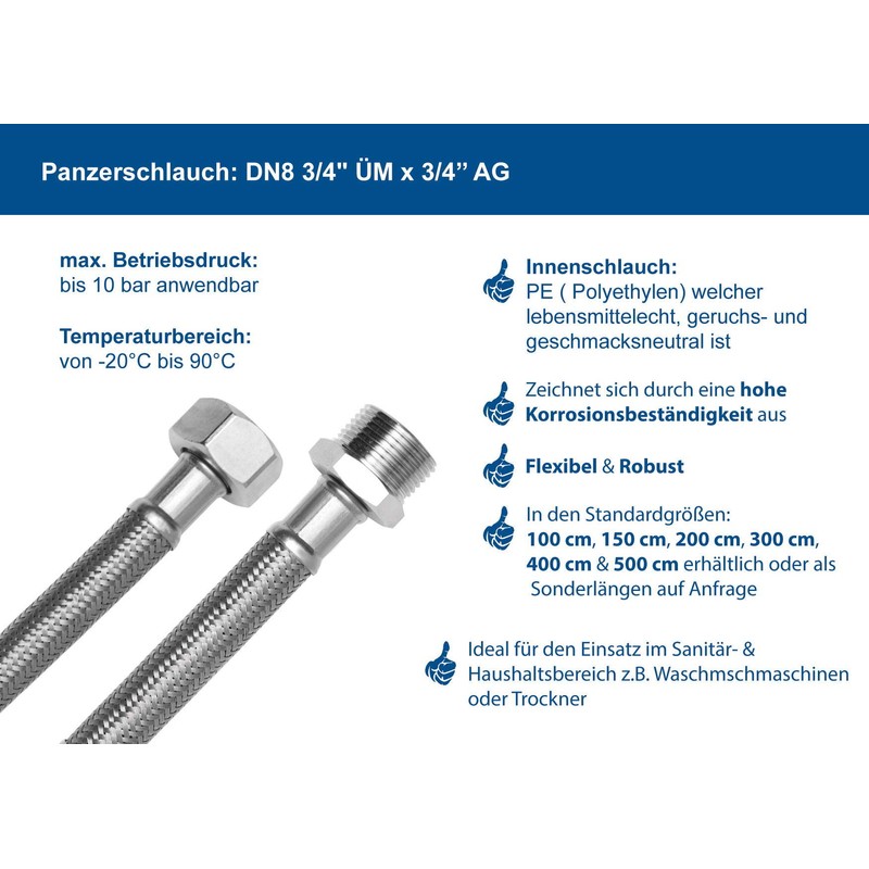 SFX® Reinforced Hose 4 m Flexible Hose 3/4 Inch Nut x 3/4 Inch Male Thread DN8 Washing Machines Dishwasher Hose Extension Inlet