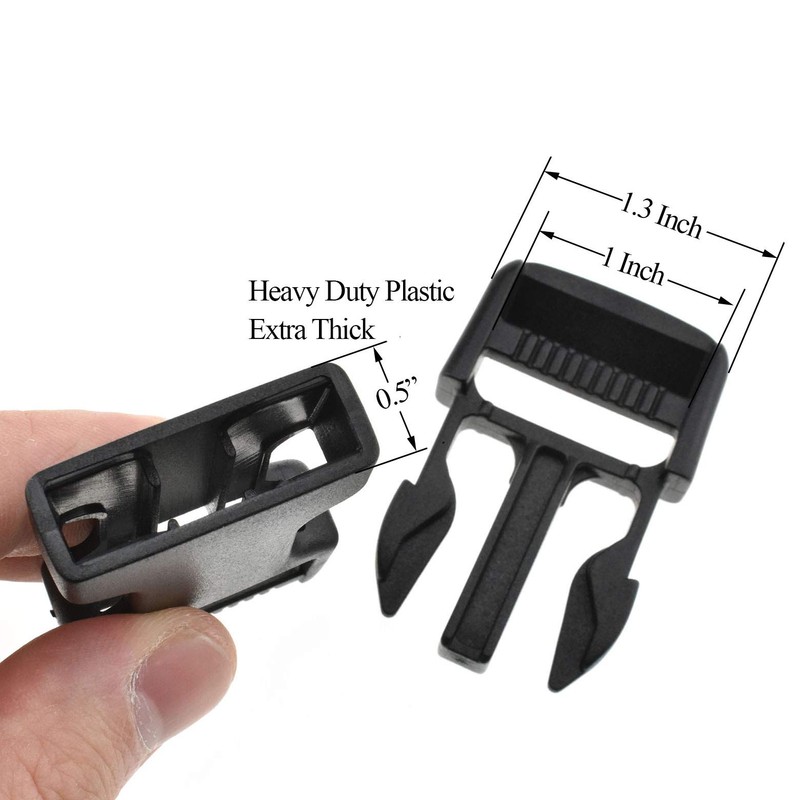- SIZE:Fit the 1 inch wide strap.Buckle itself’s length:3”(extra long),wide:1.3”,thickness:0.5”.Side release buckles are great for webbing buckles,easy one-handed release and no accidental release.