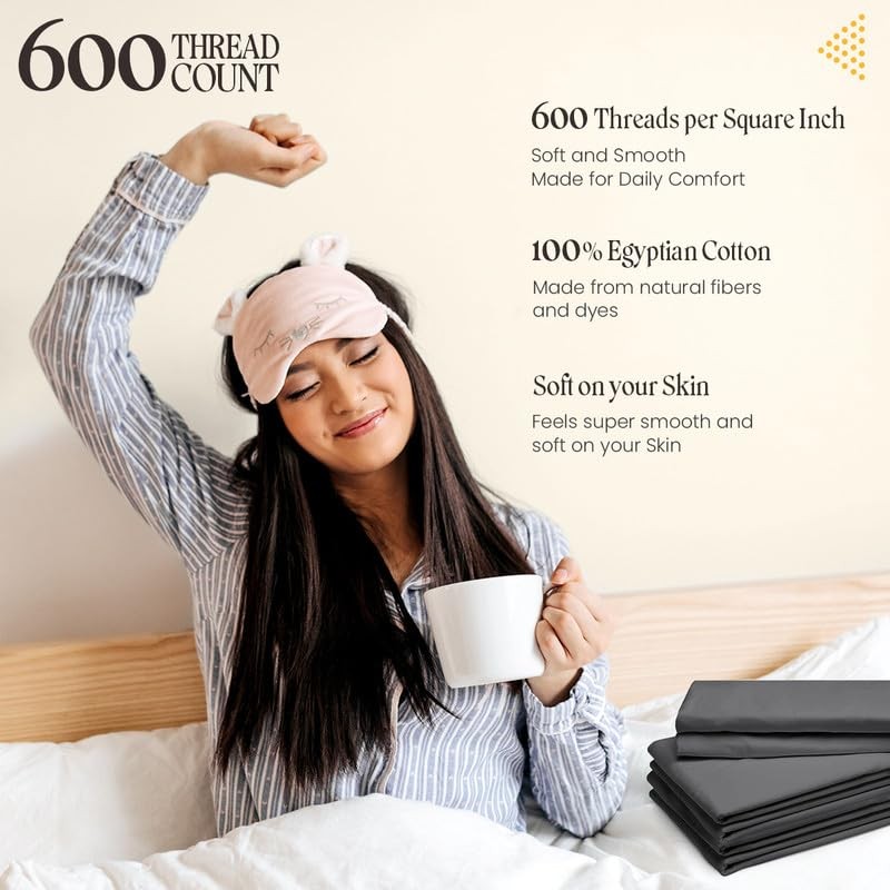 - Luxury Cotton Sheets: Indulge in the opulence of our 600 thread count sheets crafted from 100% Egyptian cotton sateen. These sheets are breathable, soft, and thick, similar to high-end luxury hotel linens. Meticulously designed to deliver a serene sleep experience, they offer a gentle and cool feel, ensuring a cozy and peaceful sleep.