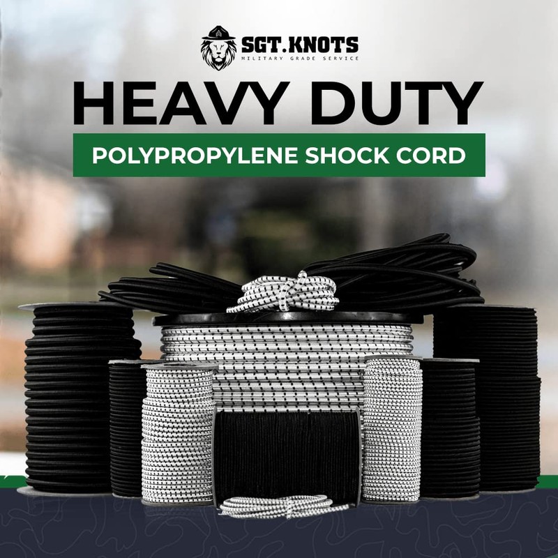 - LENGTH & WIDTH - Choose between pre-cut lengths of 10 feet, 25 feet, 50 feet, 100 feet, 500 feet, or 1,000 feet. SGT KNOTS Polypropylene Bungee Cord / Shock Rope / Elastic Cord diameter thickness options: 1/8 inch, 5/32 inch, 3/16 inch, 1/4 inch, 5/16 inch, 3/8 inch, or 1/2 inch.