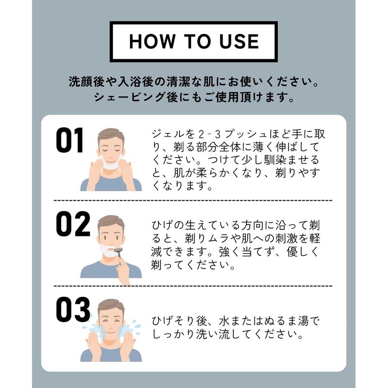 - (3) 6 types of free, paraben free, alcohol free, silicone free, synthetic fragrance free, mineral oil free, salphate free, 4) This shaving gel is made with essential oils (essential oils) without artificial fragrance. Enjoy your premium time