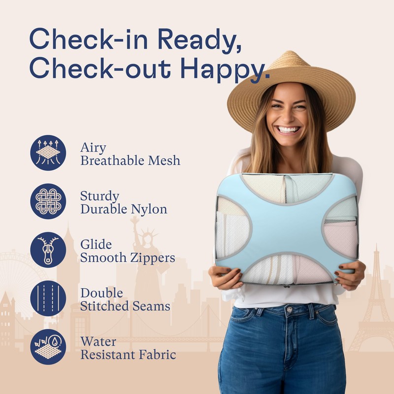 - Easy Clean Material – Watch liquids glide smoothly off your packing cubes making it easy for cleaning. Accompanied by smooth snag free ergonomic zipper pulls, pack your way through any travel adventures while resting assure your packing cubes are made from the best material.