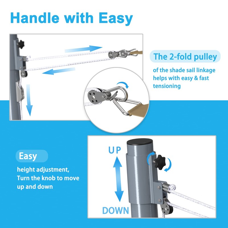 - EASY HEIGHT ADJUSTMENT-This sail shade pole kit has Double-Fold pulley of the shade sail linkage helps with easy and fast tensioning With our high-quality shade sail mast including height adjustment,you get the ideal device to reliably tension your shade sail and align it at any time according to your wishes