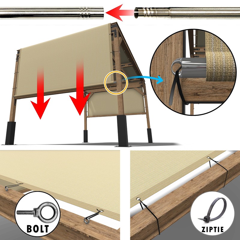 - Grommets and Weighted Rods design: Installing the Pergola Cover is a breeze, thanks to grommets placed every 2 feet. The included zip ties ensure stability and provide a neat appearance on your pergola frame. The internal poles are made of stainless steel for added stability and a beautiful overhang, ensuring a perfect fit on your gazebo frame.