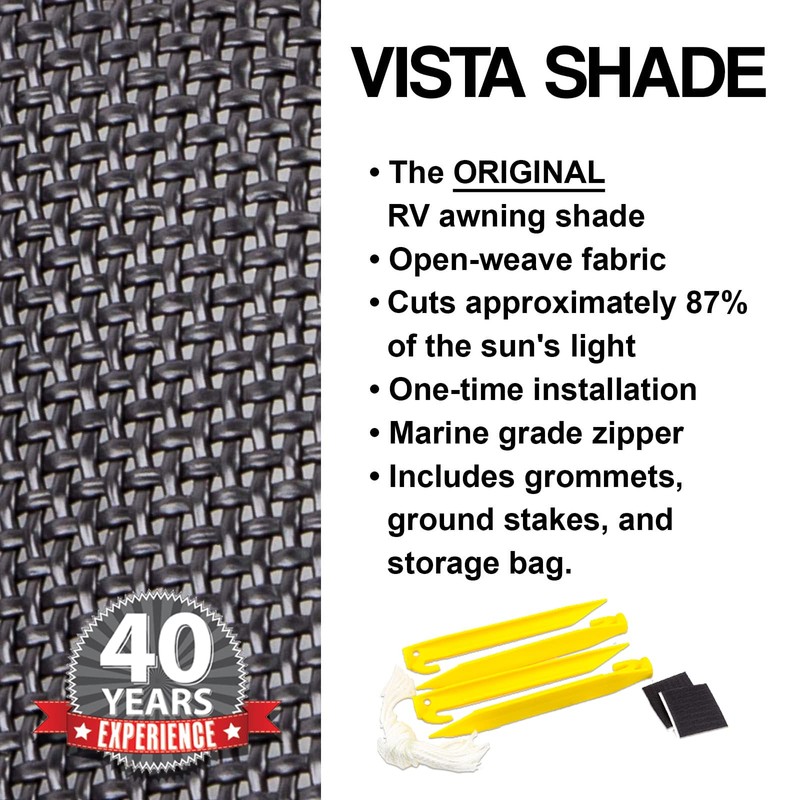 The original RV awning shade specially made for 12V RV Power Awnings! Don't let the sun or wind keep you from enjoying the great outdoors. The Vista Shade zipper sun screen rolls out flat, providing cooling shade, light wind-breaking protection, and an air of privacy wherever you roam without obscuring your view.