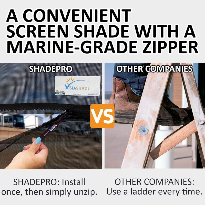 - RV Sunscreen Shade for Awning - The Original RV awning shade screen with zipper! The Vista Shade zip sun screen rolls out flat, providing cooling shade, light wind-breaking protection, and an air of privacy wherever you roam without obscuring your view of the great outdoors. Perfect to help reduce glare on outside TVs, Tablets and Phones! Sunscreen kit includes grommets, ground stakes, and storage bag. The only awning screen shade you need.