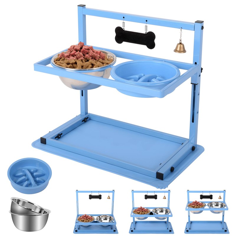 SHAINFUN Blue Raised Dog Bowl Stand with Two 1700ml Stainless Steel Food Bowl, a Slow Dog Feeder and Spill Proof Mat, Adjustable Dog Feeder, Elevated Dog Bowls for Large Medium and Small Dogs