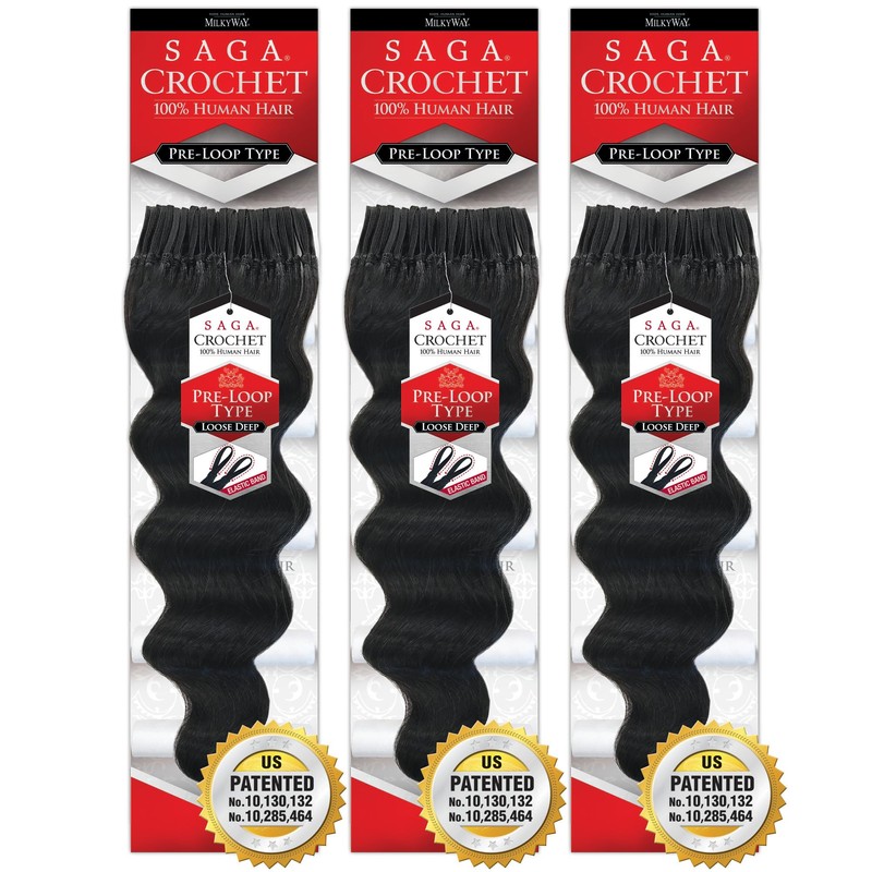 SHAKE-N-GO Saga Human Hair Crochet Braid Loop Type LOOSE DEEP 14" (1B Off Black, 3-Pack)