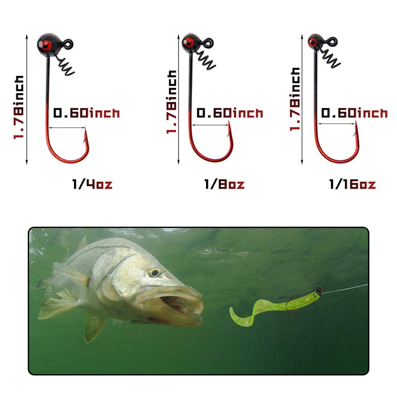- EASY TO USE: Firstly,insert the bait screw into the head of soft plastic bait. Screw in uitil bait touches lead jig head. Secondly insert the hook into the bait to keep it unmovable. Then you can enjoy your fishing!