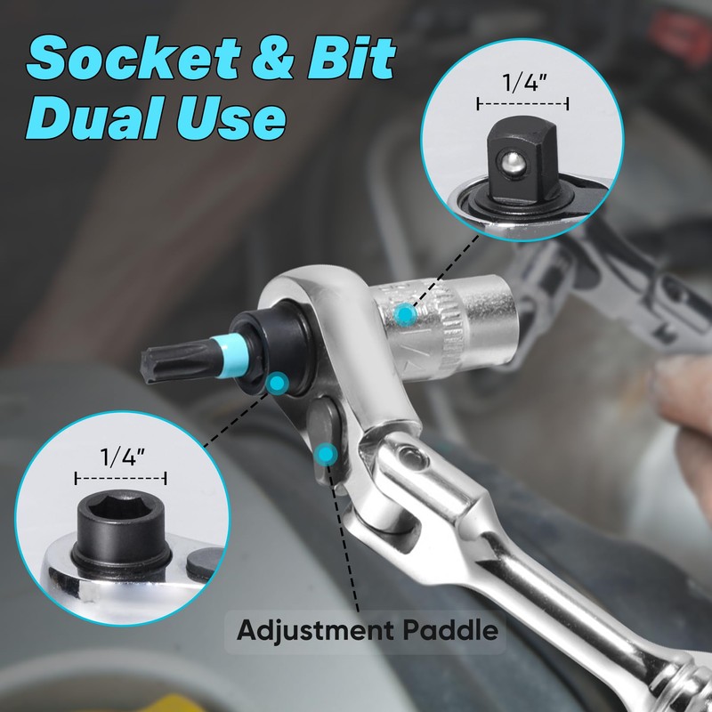 - [Precision-Engineered Versatility] The ratchet wrench combines a 1/4‘’ socket wrench with a bit driver. Excellent design allows you to use one tool to complete the use of sockets and bits. It's the ultimate solution for tackling diverse repair jobs from simple home fixes to complex automotive