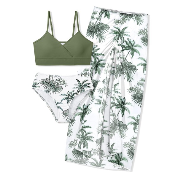 - 🌴Unique Design: Girls 3 Piece Swimsuit, V-neck solid color bikini top and removable chest pad, Adjustable spaghetti straps and high-waisted bikini bottom provides a comfortable fit. Matching stylish tropical pattern print quick dry drawstring cover up skirts, Bright colors make your child the most striking princess on the beach and reduce skin tanning! Enjoy the fun of swimming and sunshine to the fullest.