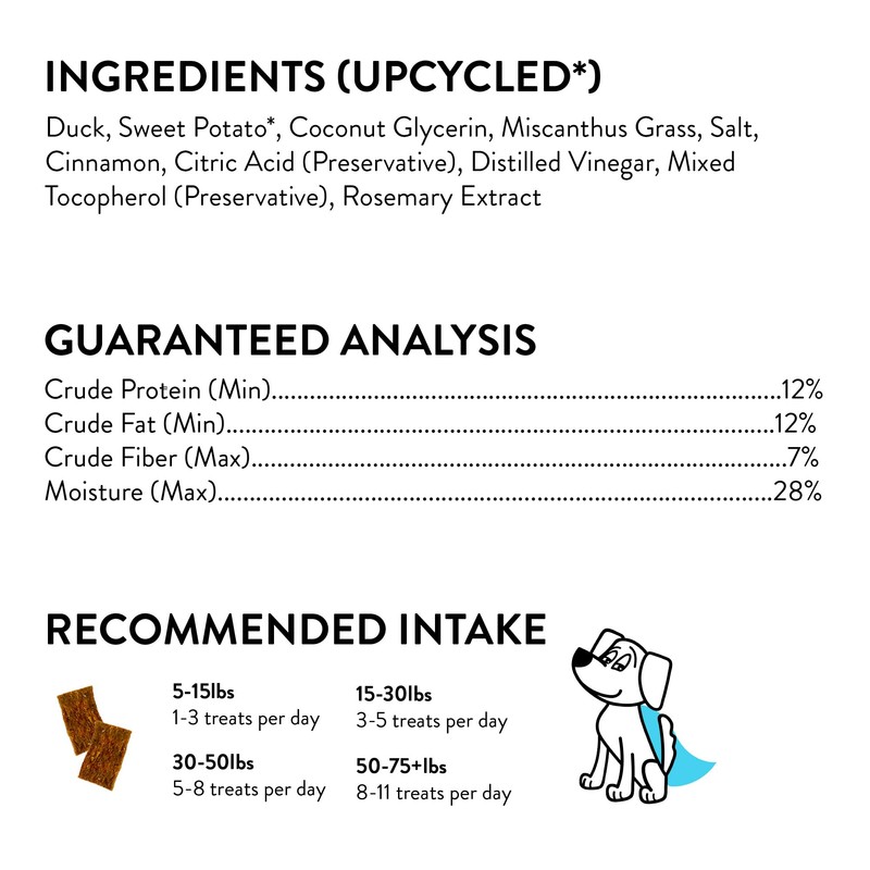 - MADE WITH UPCYCLED INGREDIENTS & RESPONSIBLY-SOURCED MEAT: The #1 ingredient is responsibly sourced meat with our cage-free duck! We also rescue unused ingredients and upcycle them to make our treats! This means every bag of our treats decreases food waste while saving valuable resources.