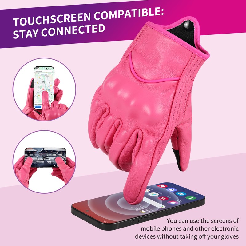 shamofeng Women Pink Genuine Leather Motorcycle Gloves Full Finger Knuckle Protection Touchscreen Compatible for BMX ATV MTB Riding, Road Racing, Cycling, Climbing, Motocross
