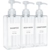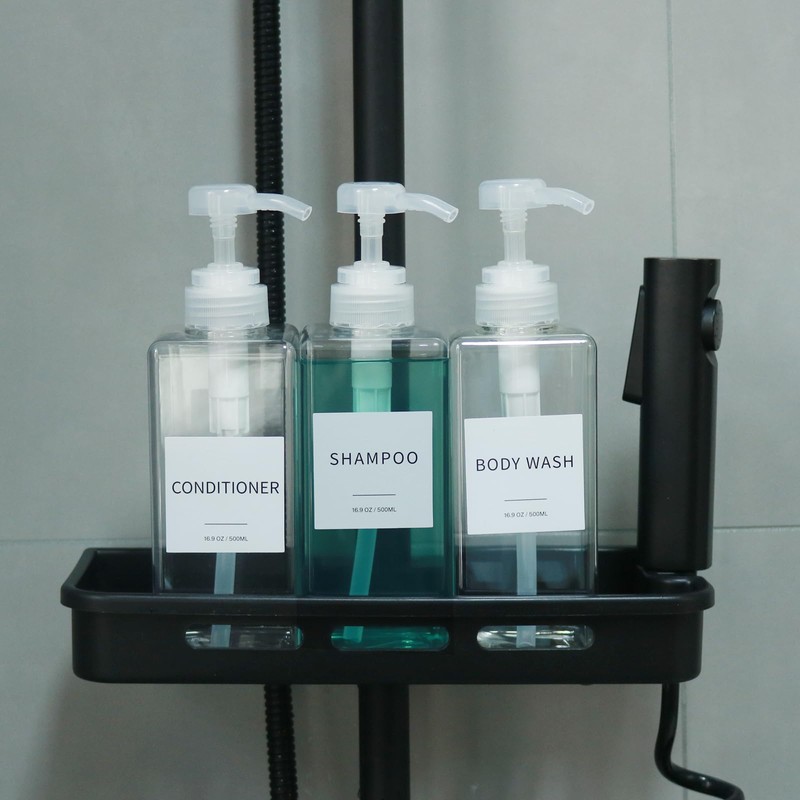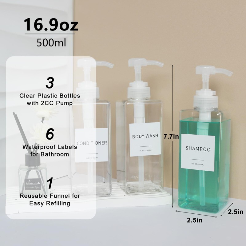 - Package Include: This shampoo dispenser set includes 3 thickened clear plastic bathroom shower dispensers, 6pcs waterproof labels and a silicone funnel to assist refill liquid.