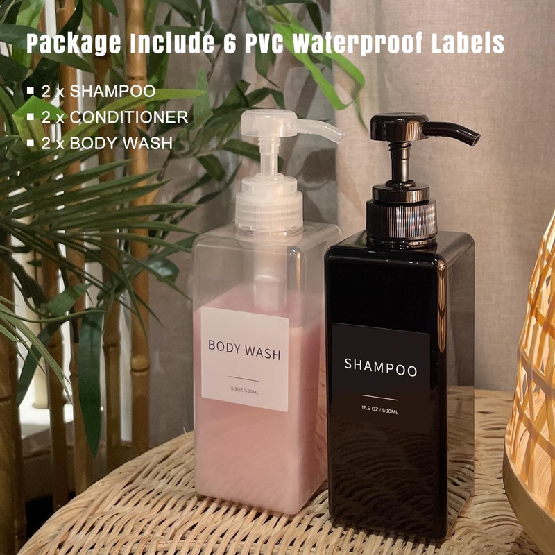 - Premium Material: These Shampoo and Conditioner Dispensers are made of extra thick PETG plastic, heavy duty and durable, will not break easily and are comfortable to use. Each bottle has a suitable capacity - 16.9oz. It also comes with 6pcs stickers in a minimalist style, which made of PVC material, waterproof and easy to clean.