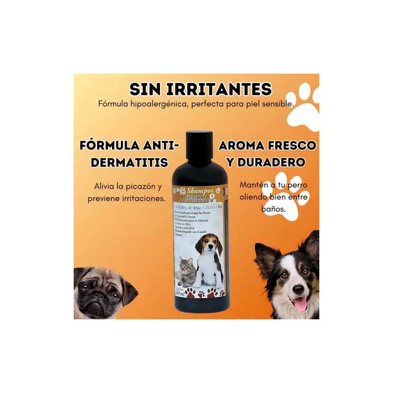 Este increíble producto 2 en 1 está diseñado para brindarle a tu perro o gato una limpieza profunda y un acondicionamiento suave que no irrita sus ojos. Con un pH balanceado y una fórmula hipoalergénica, es ideal para cualquier tipo de pelaje, ya sea corto o largo, y deja un agradable aroma fresco que actúa como barrera contra los malos olores.