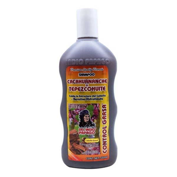 Shampoo Cacahuananche Y Tepezcohuite 550ml Del Indio Papago Control Grasa Capilar Hidrata Keratina Hidrolizada Sauco