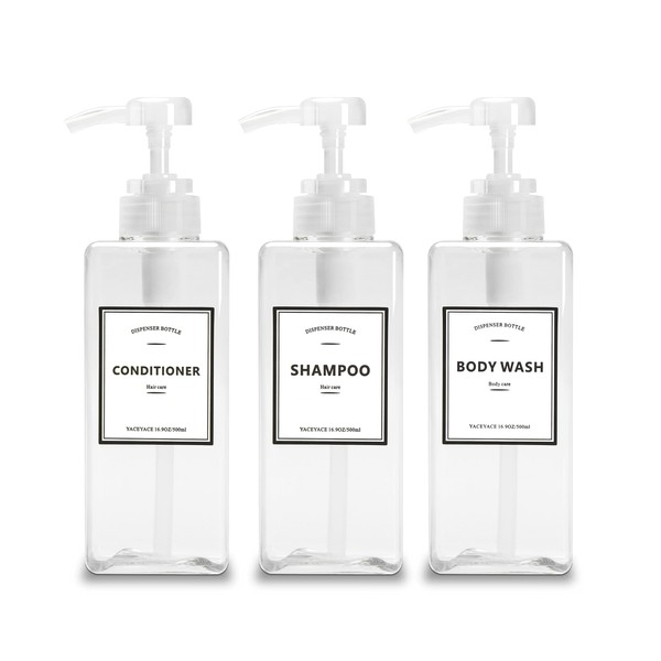 Shampoo Dispenser Refillable with Pump, YACEYACE 16.9oz Set of 3 Clear Shampoo Bottles, Empty Shampoo and Conditioner Dispenser, Shampoo Conditioner, Body Wash Dispenser Shower Refillable Bottles