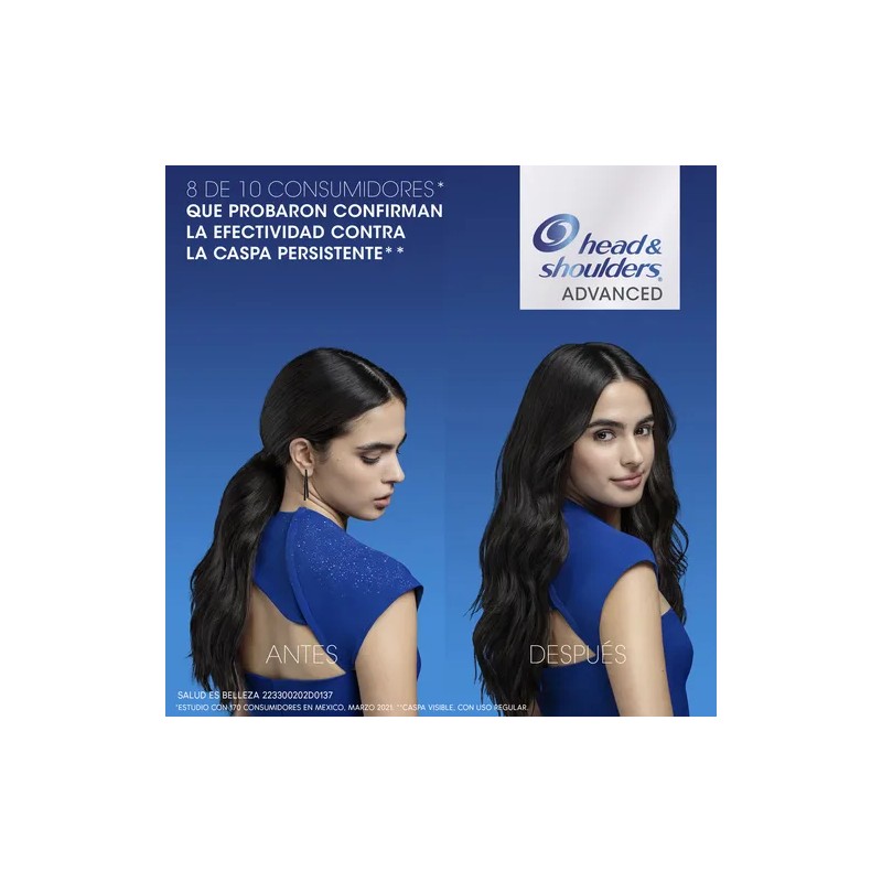 La línea Head & Shoulders ADVANCED contiene la fórmula control caspa más eficaz de Head & Shoulders. Su ingrediente activo control caspa llega hasta las áreas más difíciles, permitiendo una protección completa y efectiva por hasta 72 horas contra la caspa, hasta la más persistente. Reducción de la comezón desde el primer uso.