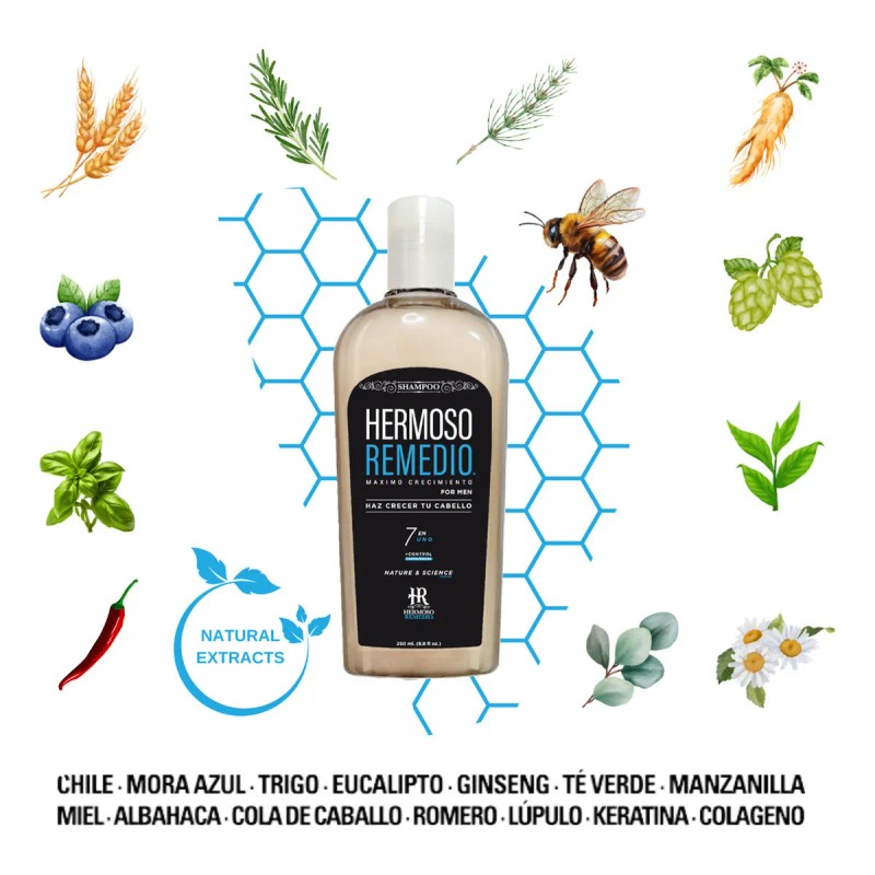 Chile, Mora Azul, Trigo, Miel, Ginseng, Te Verde, Manzanilla, Albahaca, Cola de Caballo, Romero, Lúpulo, Eucalipto, Queratina y Colágeno.