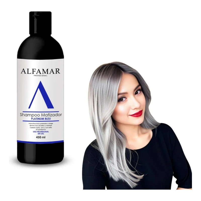 El Shampoo Matizador Azul Platinum Bleu Alfamar Sin Sal es un tratamiento ideal para neutralizar tonos no deseados en cabellos decolorados. Diseñado específicamente para eliminar los tonos amarillos, verdes y naranjas que se producen tras la decoloración, este shampoo restaura el color y devuelve el brillo natural al cabello. Al ser libre de sal, limpia suavemente sin resecar, manteniendo la suavidad y el brillo del cabello teñido. Perfecto para quienes buscan un cabello rubio o platinado impecable y radiante.