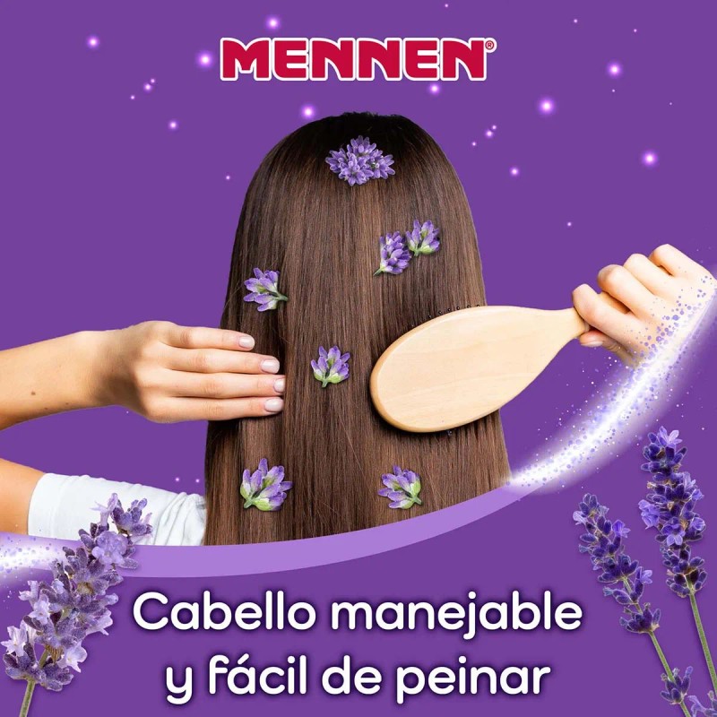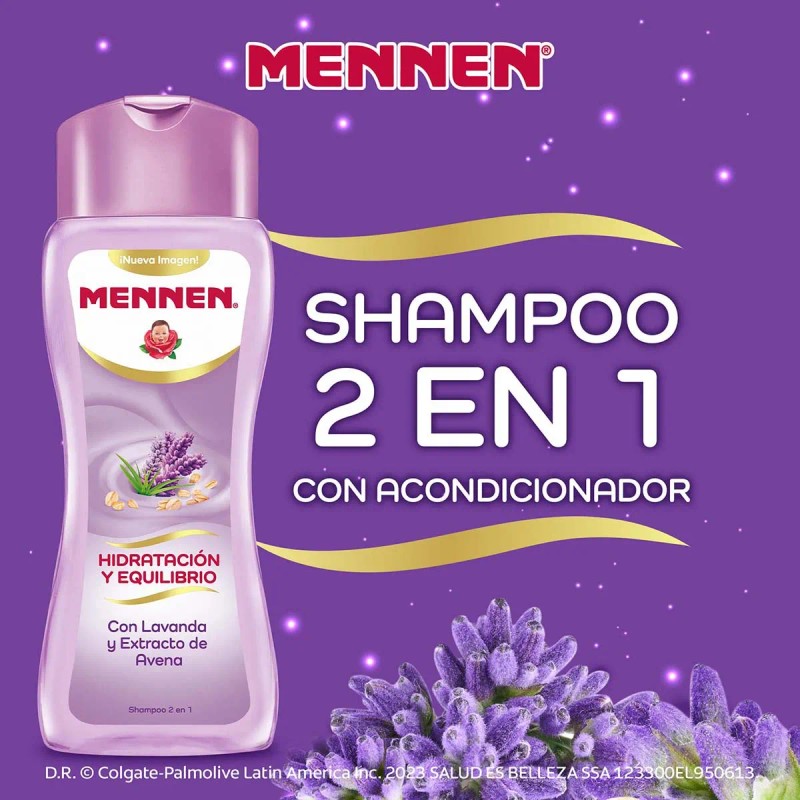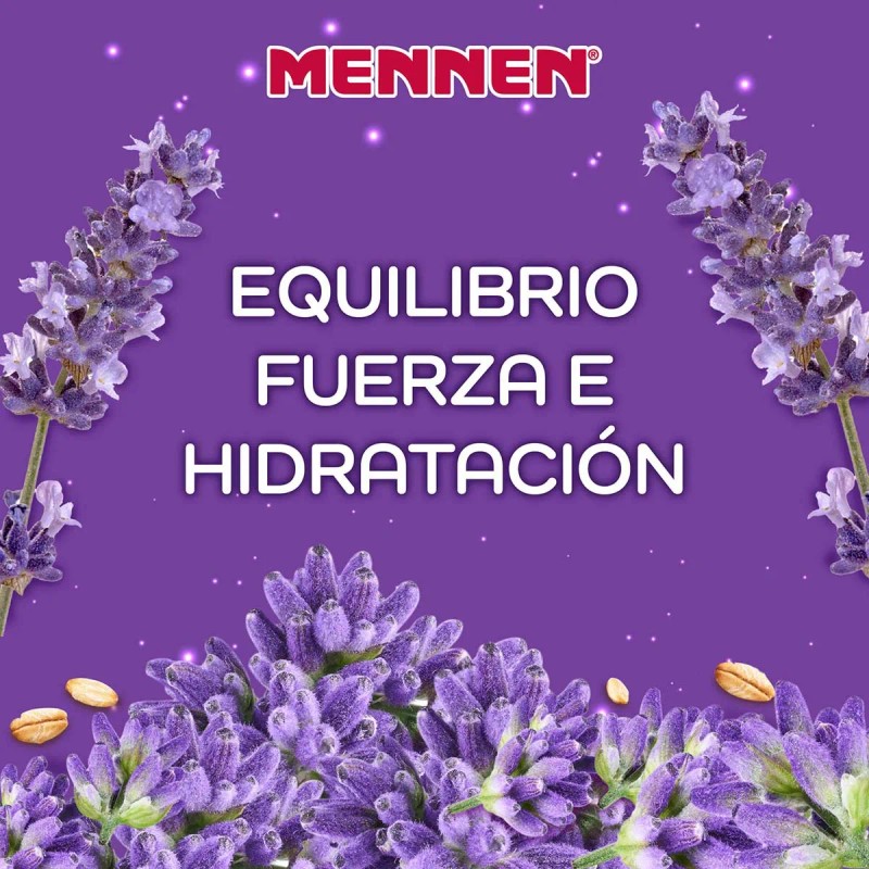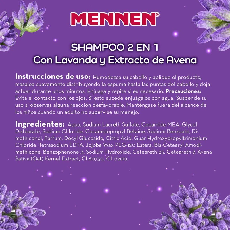 - Descubre Mennen Lavanda, un Shampoo 2 en 1 con Acondicionador diseñado para proporcionar hidratación y equilibrio para toda tu familia. El Shampoo enriquecido con Extracto de Avena y Lavanda no solo limpia y acondiciona, sino que también da fuerza a tu cabello, dejándolo manejable y fácil de peinar. Actúa como un desenredante eficaz, eliminando nudos para un cabello suave y brillante. Su fragancia con Tecnología Esencia Relax brinda una experiencia relajante para todo tu hogar, elevando el baño a un momento de tranquilidad, donde cada lavada es una oportunidad para renovar el equilibrio, la fuerza y la vitalidad de tu cabello. Características: