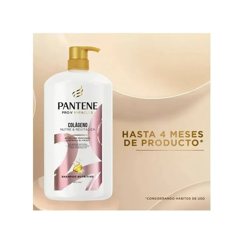 - V Miracles Colágeno Nutre y Revitaliza te ayudará. Con el shampoo Pantene, tu cabello maltratado recibirá una nutrición profunda para revitalizarlo sin dejarlo pesado. Su fórmula con colágeno 100% natural, aceite de macadamia, provitamina B5 y antioxidantes nutre profundamente tu cabello dejándolo suave, brillante y liviano. Sin parabenos, sin aceite mineral, sin sal' y con envase reciclable. Simplemente aplícalo sobre el cabello húmedo, masajea suavemente el cuero cabelludo con la yema de los dedos en movimientos circulares y enjuaga. Su aroma irresistible proporcionará una nutrición profunda para revitalizar el cabello sin dejarlo pesado. Beneficios: