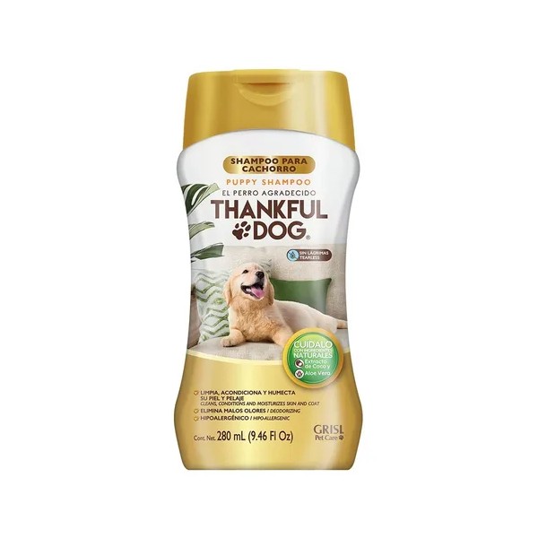 Shampoo Para Cachorro Thankful Dog 280ml: Desarrollado con un pH especial para cachorros, su fórmula hipoalergénica y extra suave no irrita la piel ni los ojos del cachorro, haciéndola más segura para ellos. Contiene una variedad de ingredientes naturales que ayudan a acondicionar y humectar su piel para tener un pelaje visiblemente más saludable. Además, disuelve la mugre del pelo y piel manteniéndolo limpio por más tiempo, con un pelaje brillante y sedoso. Elimina malos olores dejando un aroma agradable.