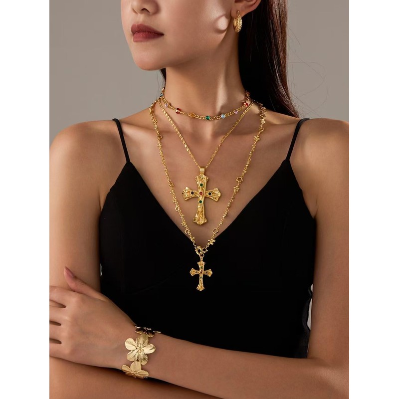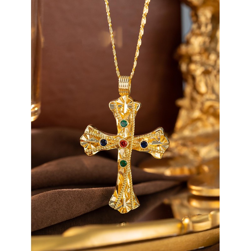 SHANG JIURUI Luxurious Gold-Plated Cross Necklace with Multi-Colored Gemstone...