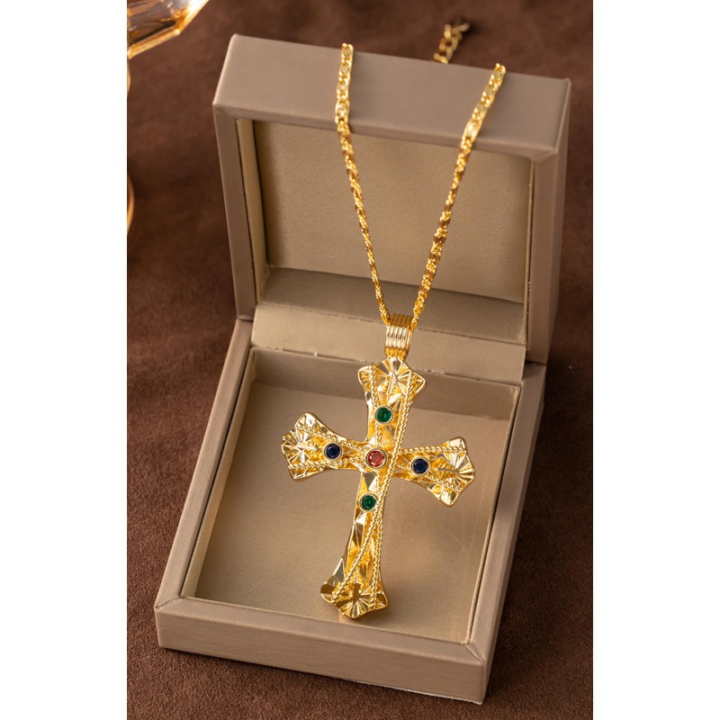 Elevate your jewelry collection with our exquisite gold-plated cross necklace, thoughtfully designed with a blend of spirituality and style. The pendant features a rich gold finish detailed with a filigree pattern and embellished with carefully selected gemstones, each adding a unique touch of color and meaning. This necklace adjusts easily for a comfortable fit and is perfect for both everyday wear and special occasions. Whether as a gift for a loved one or a personal treat, this cross necklace is sure to inspire and impress.