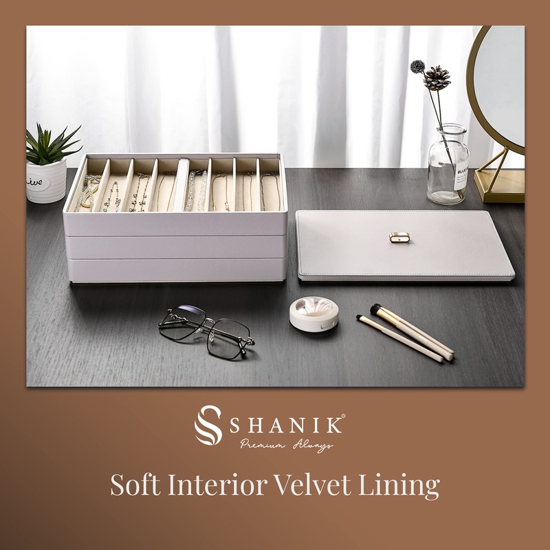 Shanik Stackable Jewelry Tray Organizers, 3 Pc. Set, Cute Designer Storage with Soft Velvet Surfaces to Protect Rings, Necklaces, Bands, and Earrings, Custom Display, Large Capacity, Grey