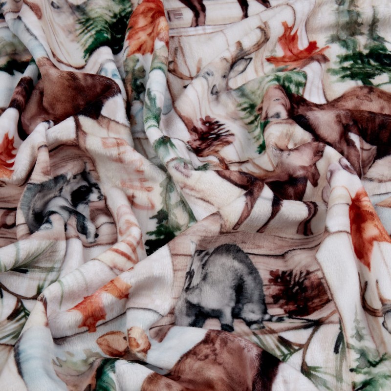 - This Cuddle minky fabric has an outdoorsy, almost-rustic flair, featuring alternating bear, moose and deer illustrations paired with beautiful forest foliage. Perfect for creating a throw blanket for a cabin or forest-themed accent pillows and bedding.