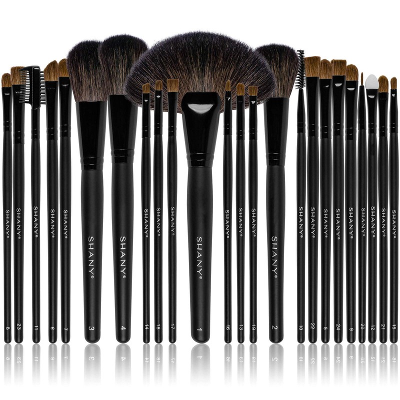 The SHANY Studio-Quality Natural Cosmetic Brush Set with Faux Leather Pouch (Set of 24 Brushes, Goat and Badger Hair) provides professional-grade tools for all of your makeup applications. Made from natural animal hair, this set includes 24 soft, durable brushes ranging from large fan to small angled styles. The brushes apply makeup evenly and are easy to clean. For easy storage and portability, the brushes come packaged in a handy black organizer.
