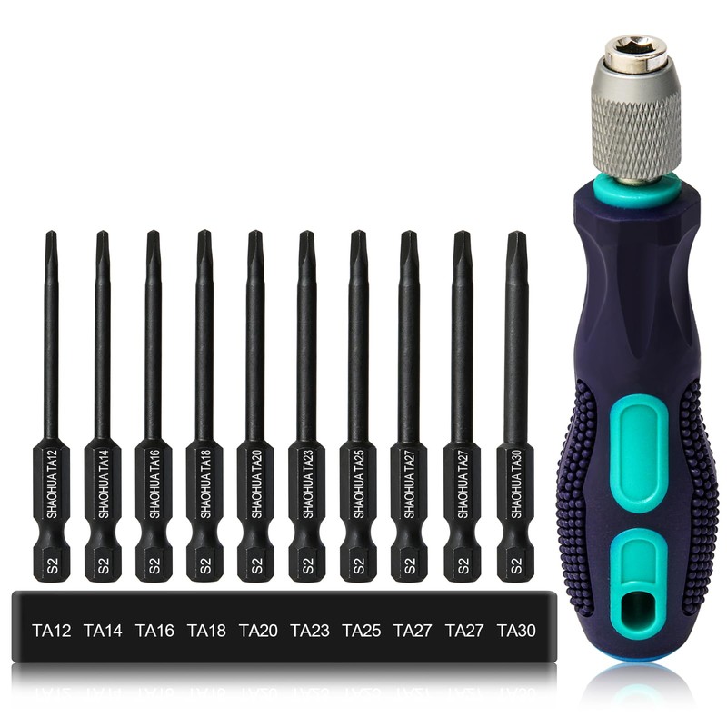 SHAOHUA Triangle Screwdriver Set w/ 1/4" Quick Change Bit Driver, 10PCS S2 Steel Triangular Screwdriver Bits Sizes TA12, TA14, TA16, TA18, TA20, TA23, TA25, TA27(x2), TA30, 1/4 Inch 65mm Triangle Bits