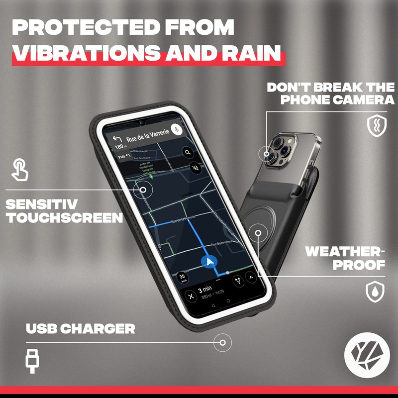 - STRONG AND ANTI-VIBRATIONS: Our unique magnetic system withstands up to 8 kilos : cobblestones, pothole, speed bumps, no matter your speed...it won't move. Tested at more than 150mph (225km/h), the sleeve will protect your smartphone from road and engine vibrations. Your smartphone is safe.