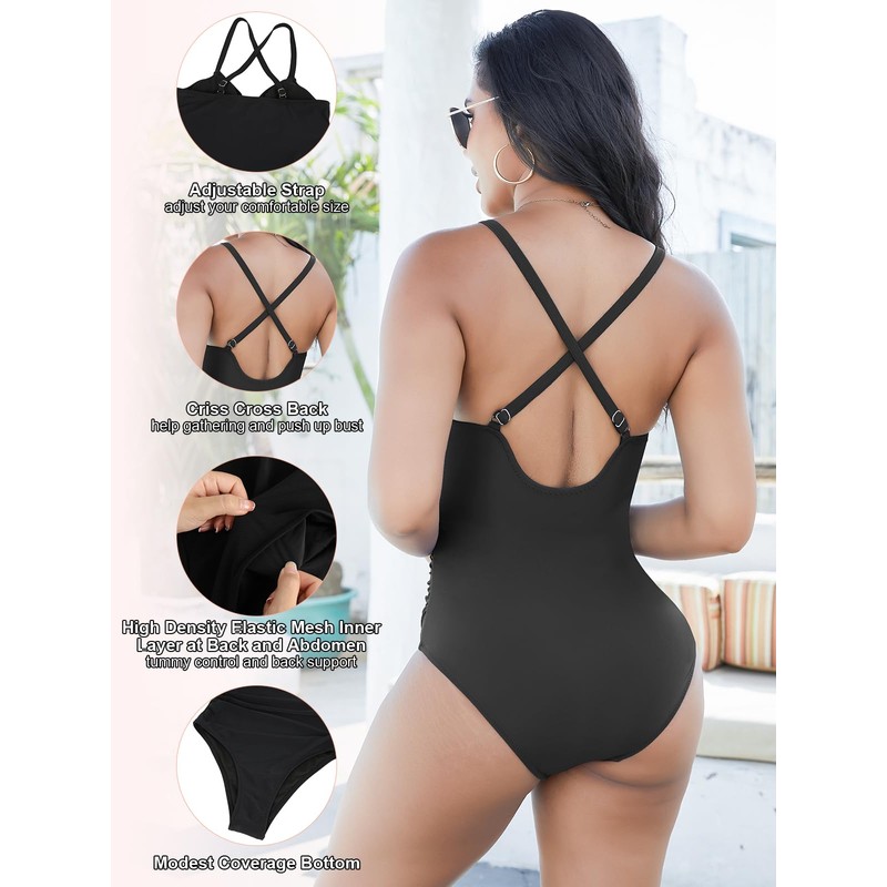 - Designs: This Womens One Piece Swimsuit Tummy Control Bathing Suit Features Sexy Deep V Neck,Twist Front, Stylish and Trendy. Built in Detachable Padded Bras, Fit for all Cups. Adjustable Spaghetti Strap,You Can Adjust for Your Size, Ensuring You Enjoy Wearing One Piece Swimsuit When You Move. Crisscross Back Swimsuit Help Gather Your Bust,Perfectly Show Off Your Sexy and Feminine.