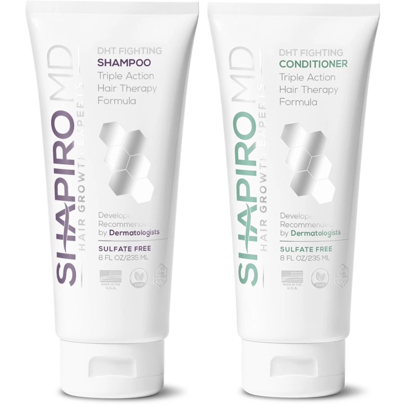 Shapiro MD Shampoo and Conditioner contain three powerful and natural active ingredients that have been shown in clincial studies to block the effects of DHT (dihydrotestosterone), the hormone that is widely believed to be a leading cause of hair loss. The patented formula, created by expert dermatologists, is designed for use by men and women of all hair types.