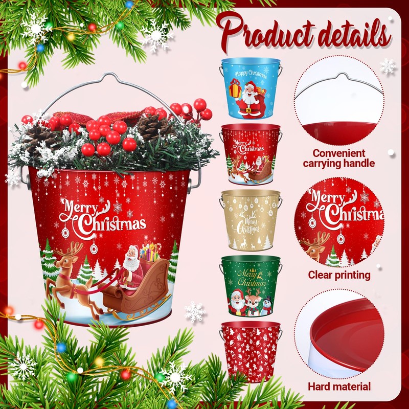 - Christmas Features: elevate your festive decoration with our Christmas metal pail's standout features; Complete with a convenient handle, the bucket is adorned with many classic Christmas elements, such as Santa, reindeer, snowman, snowflake and more, available in 5 styles; Charm your guests with this festive centerpiece