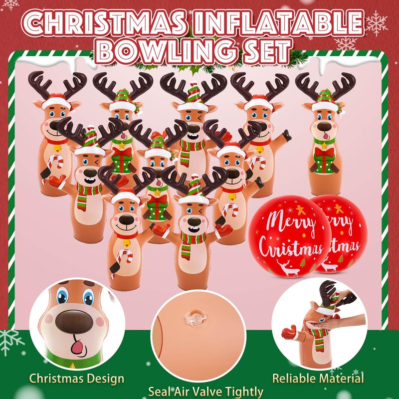 - Package Content: you will receive 12 pieces of outdoor Christmas Inflatable bowling set, including 2 pieces of bowling balls with a diameter of approximately 12 inch/ 30 cm, 10 pieces of Christmas Elk bowling pins with a size of approximately 28 x 9 inch/ 71.12 x 22.86 cm, adding fun and joy to party activities