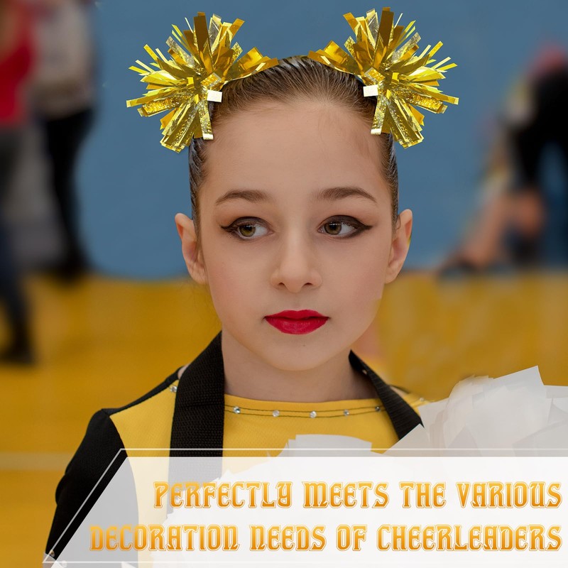 - Versatile Color and Compact Size: our cheering pom poms comes in classic gold and metallic colors, making them ideal for matching with various uniforms and team gear; With a cheerleading pompom diameter of 4 inch/ 10cm, these bands are the proper size to stand out without being cumbersome; The bands' diameter is 2 inch/ 5cm (elastic), allowing them to fit comfortably and securely on most hair volume
