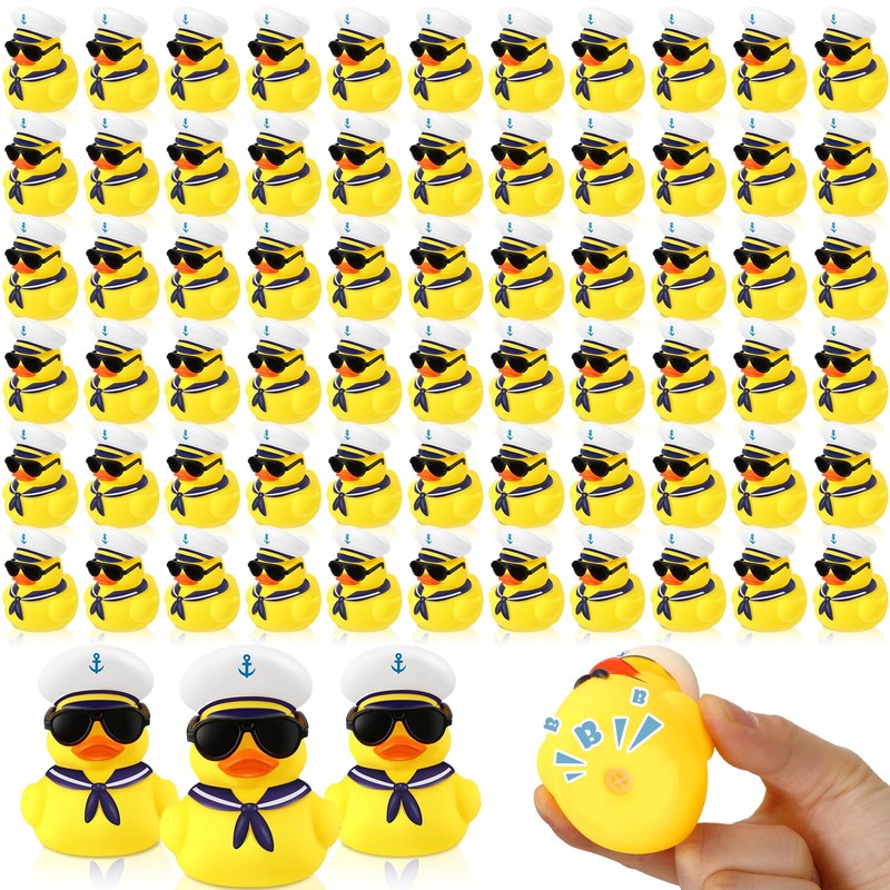 - What's in the Package: you will receive 36 cruise ship ducks, paired with 36 black mini sunglasses, and the ducklings have sound devices installed on the bottom, which can be pressed and squeezed to make a sound, enough to share with family or mates
