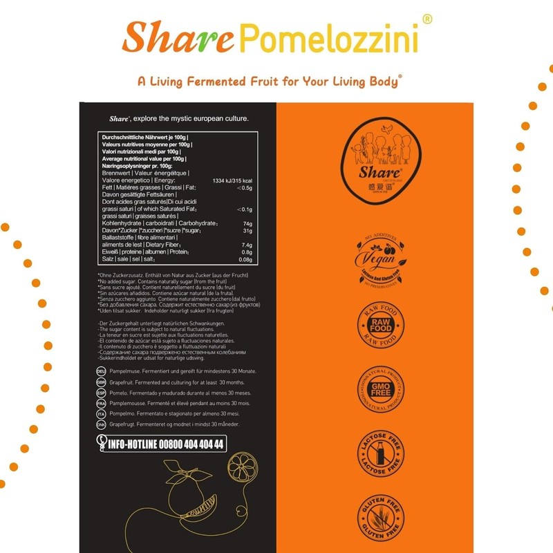 - TRADITIONAL ASIAN CULTURE: With a fermentation period of over 30 months in its own fruit juice, Share Pomelozzini embodies all the benefits of the pomelo, concentrated into a juicy praline experience.