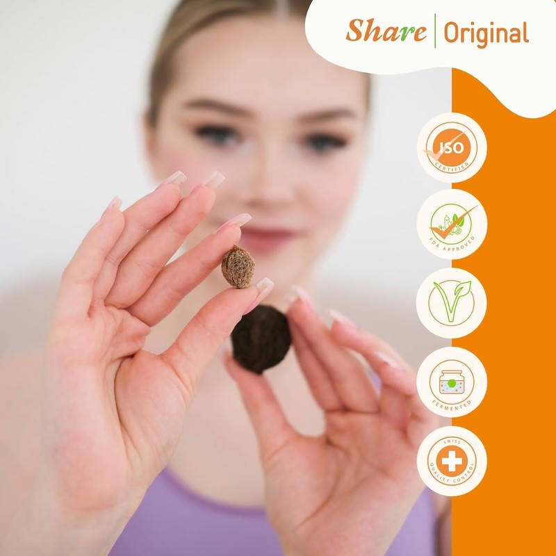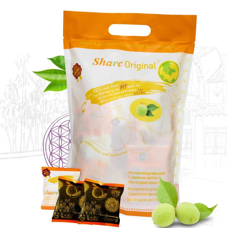 Our Share Original plums grow wild in a 150-square-kilometer bee conservation area in Southeast Asia and are hand-harvested. We then ferment the "Prunus mume," the botanical name for the fruit, for a minimum of 30 months in its own juice. The recipe for this process has been a closely guarded secret for decades. Following fermentation, our Share Original plums are coated with high-quality herbs (mulberry fruit, yerba mate, natural carotene extract). And finally, because the best comes last, we individually package each plum airtight to allow for further fermentation inside the package. Natural alternative to lab-made laxative and probiotics;The processing of our Share plum is a meticulous and time-consuming process. Fermented for up to 30 months and carefully coated with a special blend of selected herbs, it develops a unique flavor profile and achieves high nutritional value. These fermented fruits are rich in essential nutrients, enzymes, and fiber, making them an excellent addition to your diet. We recommend consuming at least one Share plum daily. You can take them in the evening after a meal or, if it suits you, even before a meal. This ensures you get the most out of this wonderful natural product. Discover the power of Share plum today!