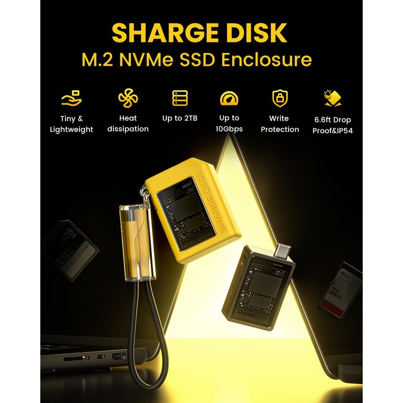 Sharge - Carcasa SSD M.2 NVMe con Sistema de refrigeración Activa, USB C 3.2 Gen2 de 10 Gbps, soporta M Key y SSD de tamaño 2230, Amarillo. No Incluye SSD